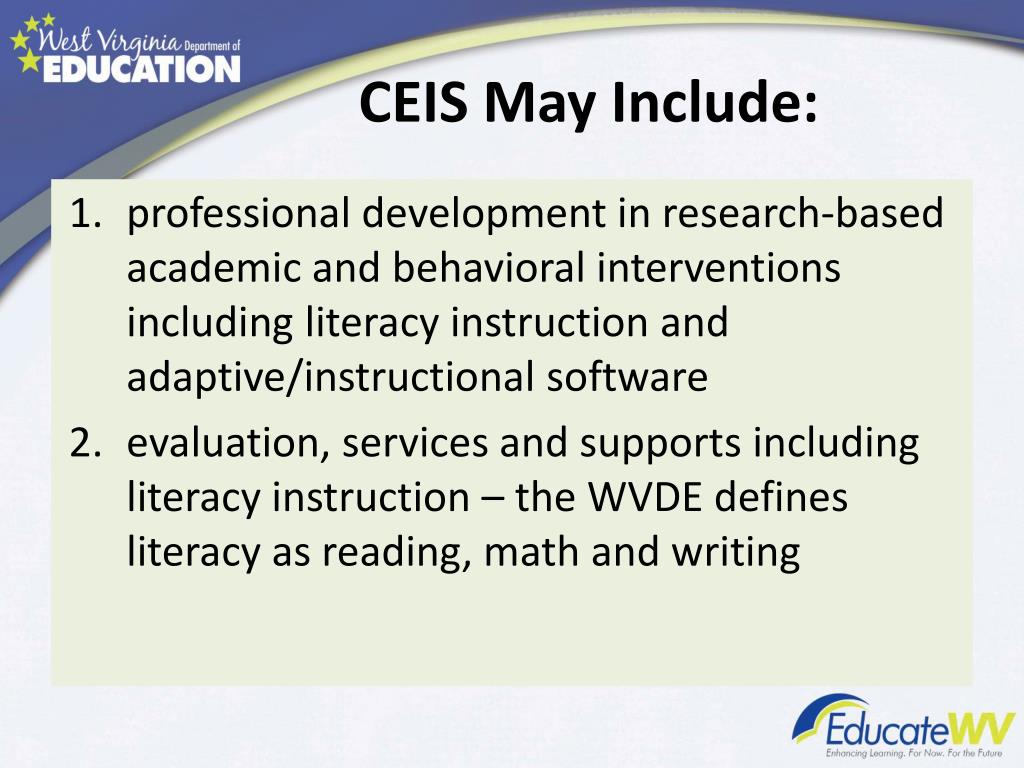 CEIS May Include: • professional development in research-based academic and behavioral interventions including literacy instruction and adaptive/instructional software • evaluation, services and supports including literacy instruction – the WVDE defines literacy as reading, math and writing