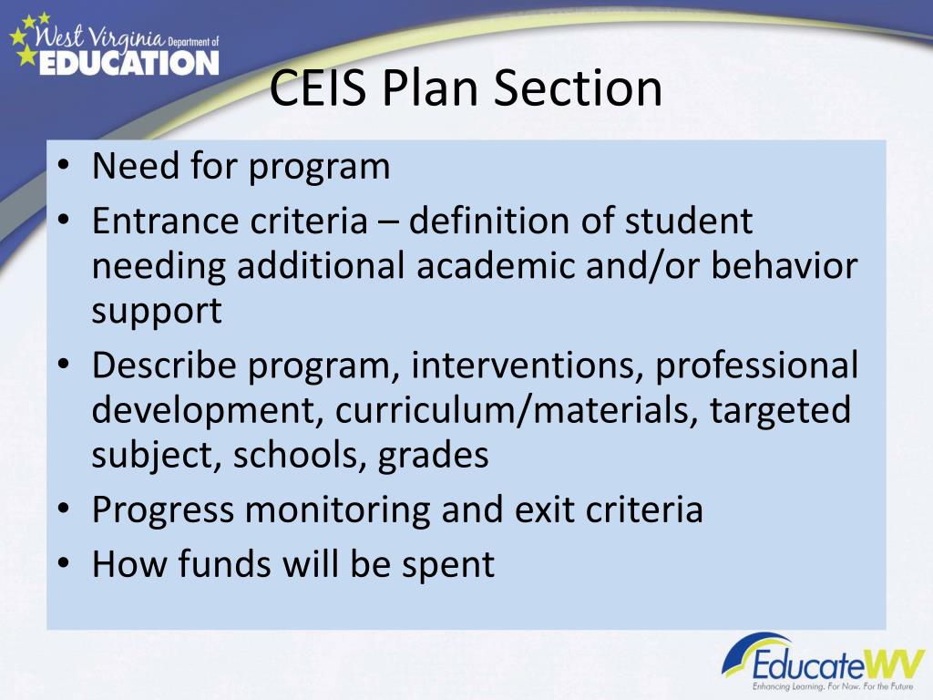 CEIS Plan Section • Need for program • Entrance criteria – definition of student needing additional academic and/or behavior support • Describe program, interventions, professional development, curriculum/materials, targeted subject, schools, grades • Progress monitoring and exit criteria • How funds will be spent