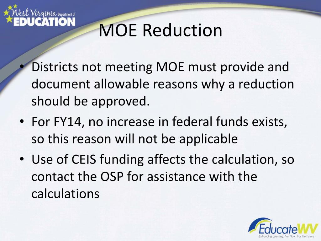 MOE Reduction • Districts not meeting MOE must provide and document allowable reasons why a reduction should be approved. • For FY14, no increase in federal funds exists, so this reason will not be applicable • Use of CEIS funding affects the calculation, so contact the OSP for assistance with the calculations