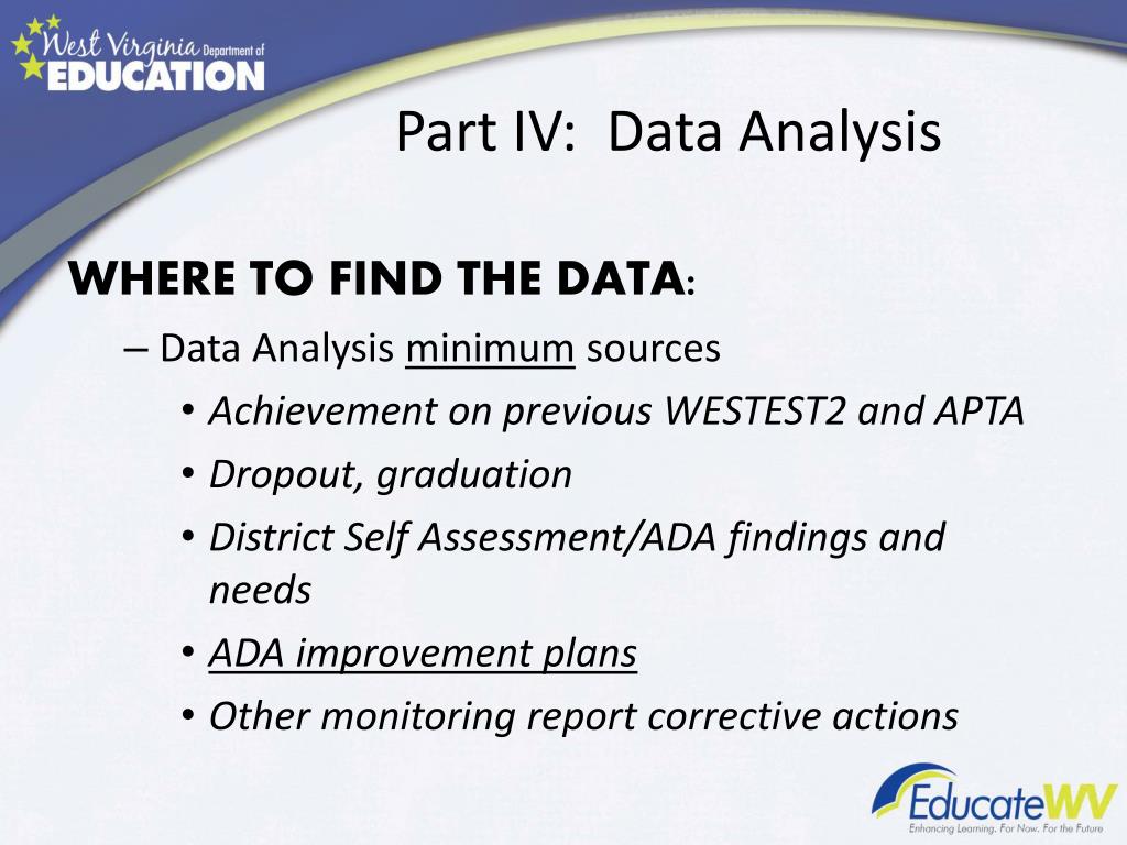 Part IV: Data Analysis WHERE TO FIND THE DATA: • Data Analysis minimum sources • Achievement on previous WESTEST2 and APTA • Dropout, graduation • District Self Assessment/ADA findings and needs • ADA improvement plans • Other monitoring report corrective actions