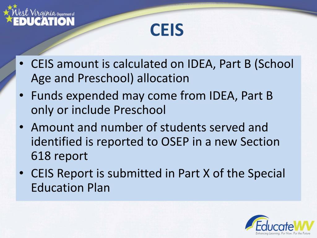 Coordinated Early Intervening Services (CEIS) • Services for students in K-12who are not identified as students with disabilities and who need additional academic and behavior supports to remain in the general education environment • Must define and identify which students are the recipients of CEIS and track them for two years to document non-eligible or eligible status. WVDE will provide tracking protocol.