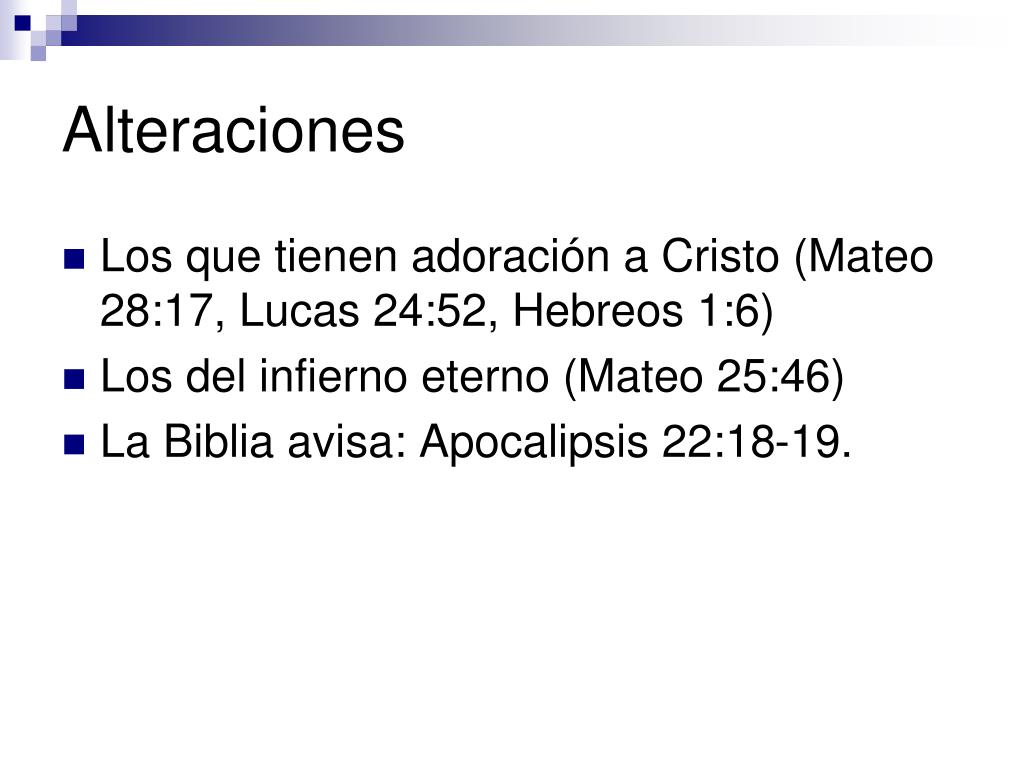 Alteraciones • Los que tienen adoración a Cristo (Mateo 28:17, Lucas 24:52, Hebreos 1:6) • Los del infierno eterno (Mateo 25:46) • La Biblia avisa: Apocalipsis 22:18-19.