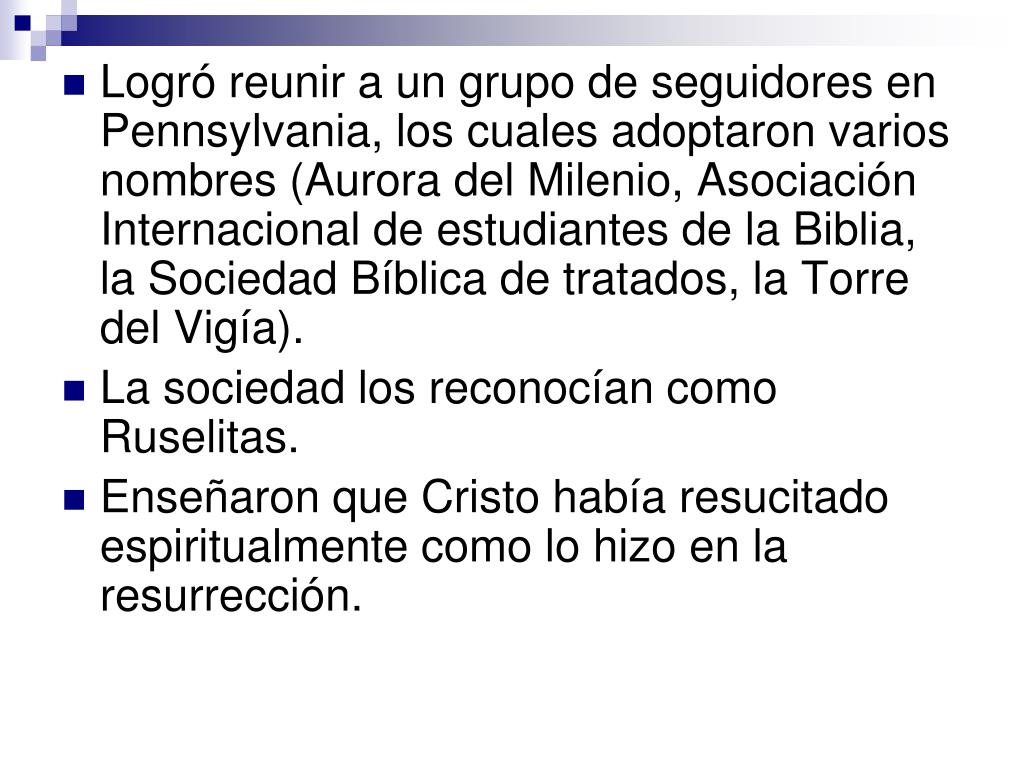 Logró reunir a un grupo de seguidores en Pennsylvania, los cuales adoptaron varios nombres (Aurora del Milenio, Asociación Internacional de estudiantes de la Biblia, la Sociedad Bíblica de tratados, la Torre del Vigía). • La sociedad los reconocían como Ruselitas. • Enseñaron que Cristo había resucitado espiritualmente como lo hizo en la resurrección.