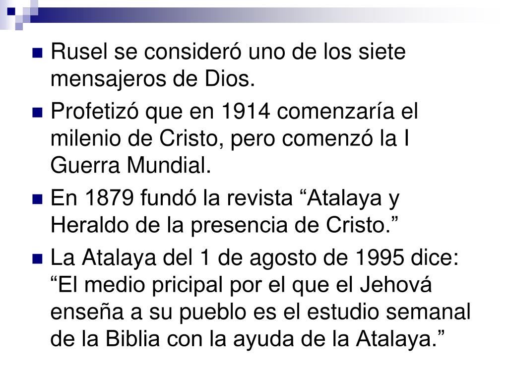Rusel se consideró uno de los siete mensajeros de Dios. • Profetizó que en 1914 comenzaría el milenio de Cristo, pero comenzó la I Guerra Mundial. • En 1879 fundó la revista “Atalaya y Heraldo de la presencia de Cristo.” • La Atalaya del 1 de agosto de 1995 dice: “El medio pricipal por el que el Jehová enseña a su pueblo es el estudio semanal de la Biblia con la ayuda de la Atalaya.”