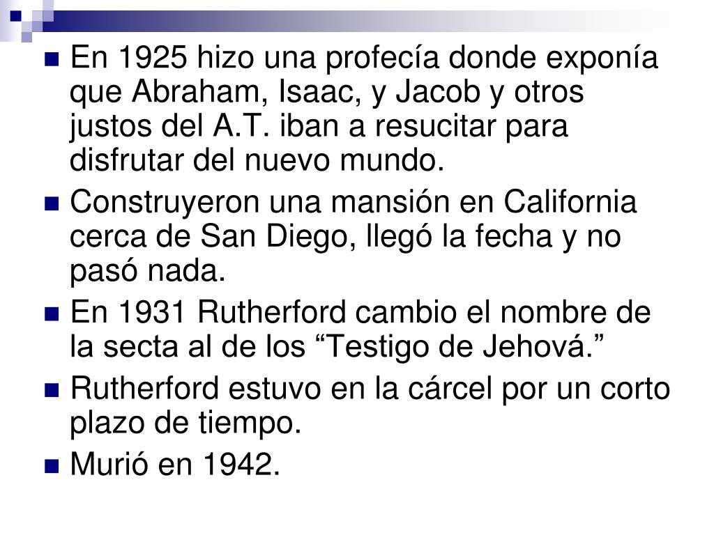En 1925 hizo una profecía donde exponía que Abraham, Isaac, y Jacob y otros justos del A.T. iban a resucitar para disfrutar del nuevo mundo. • Construyeron una mansión en California cerca de San Diego, llegó la fecha y no pasó nada. • En 1931 Rutherford cambio el nombre de la secta al de los “Testigo de Jehová.” • Rutherford estuvo en la cárcel por un corto plazo de tiempo. • Murió en 1942.