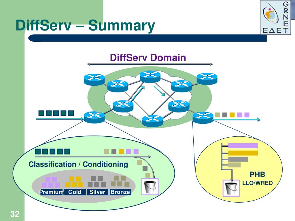 DiffServ Domain Classification / Conditioning PHB LLQ/WRED Premium Gold Silver Bronze DiffServ – Summary
