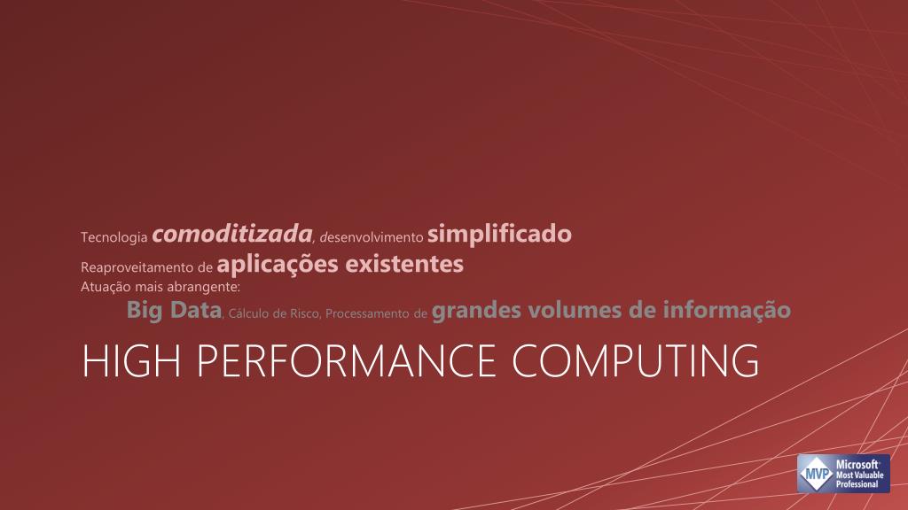 Windows Server HPC • Plataforma da Microsoft para computação em alta performance • Escala para milhares de núcleos • Na versão 2012 (quarta versão do HPC para Windows), permite que um cluster utilize VMs no Windows Azure