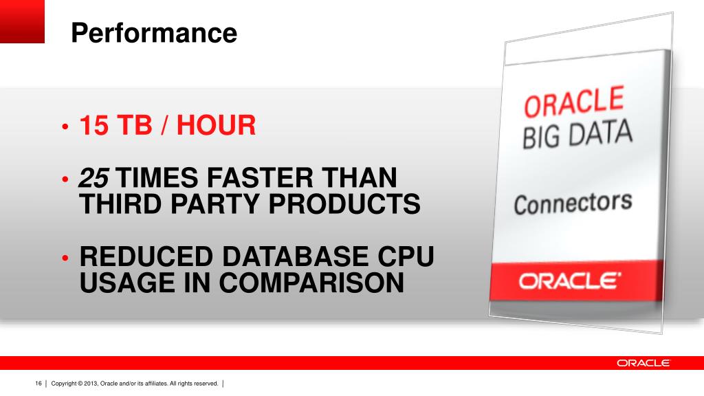 Key Benefits • Extremely fast load performance • 15 TB/hour from Oracle Big Data Appliance to Oracle Exadata • Load data pump files for reduced database CPU usage • Unique option to query HDFS data in-place • Easy to use for Oracle DBAs and Hadoop developers • Developed and supported by Oracle