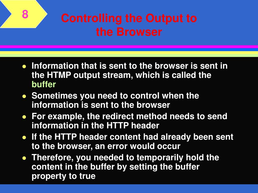 8 Controlling the Output to the Browser • Information that is sent to the browser is sent in the HTMP output stream, which is called the buffer • Sometimes you need to control when the information is sent to the browser • For example, the redirect method needs to send information in the HTTP header • If the HTTP header content had already been sent to the browser, an error would occur • Therefore, you needed to temporarily hold the content in the buffer by setting the buffer property to true