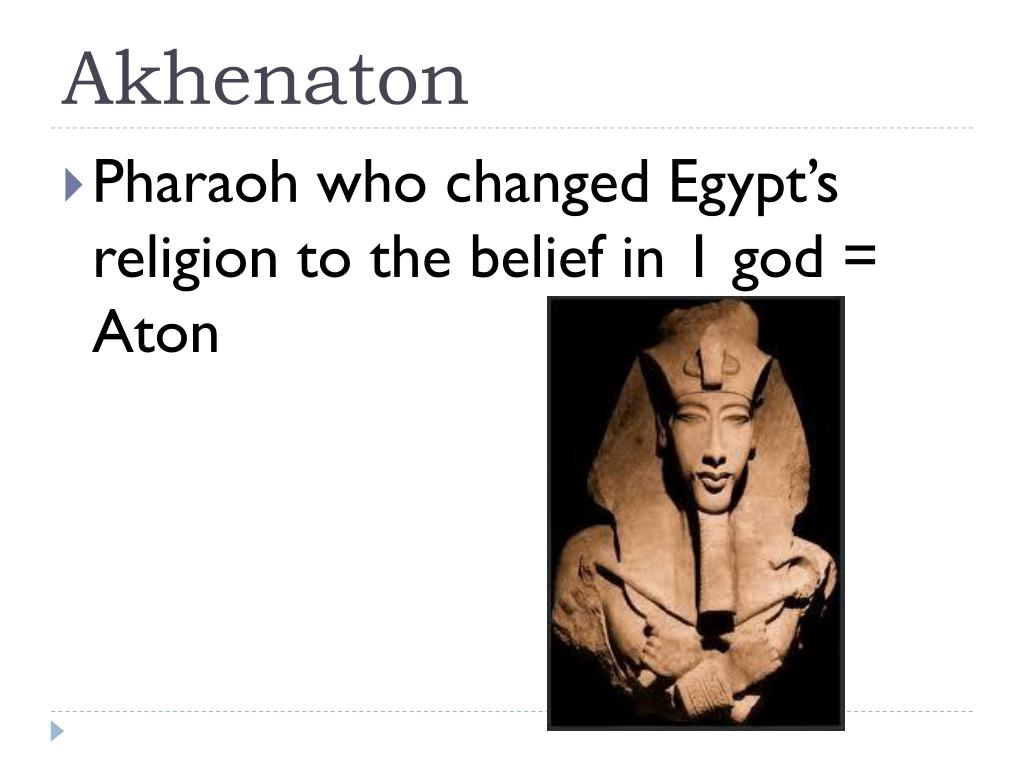 Akhenaton • Pharaoh who changed Egypt’s religion to the belief in 1 god = Aton