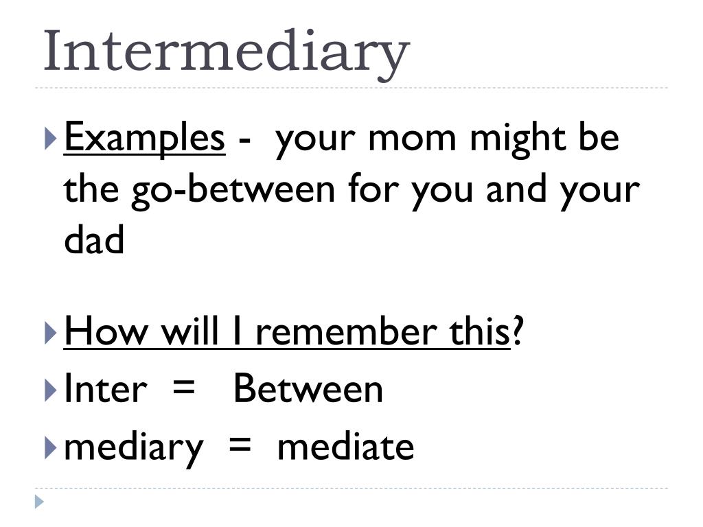 Intermediary • Examples - your mom might be the go-between for you and your dad • How will I remember this? • Inter = Between • mediary = mediate