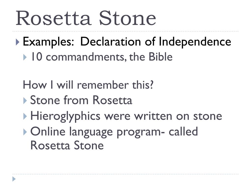 Rosetta Stone • Examples: Declaration of Independence • 10 commandments, the Bible How I will remember this? • Stone from Rosetta • Hieroglyphics were written on stone • Online language program- called Rosetta Stone