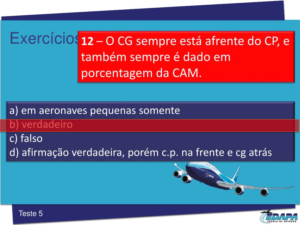 Exercícios 12 –O CG sempre estáafrente do CP, e também sempre é dado emporcentagem da CAM. a) em aeronaves pequenas somente b) verdadeiro c) falso d) afirmação verdadeira, porém c.p. na frente e cg atrás Teste 5
