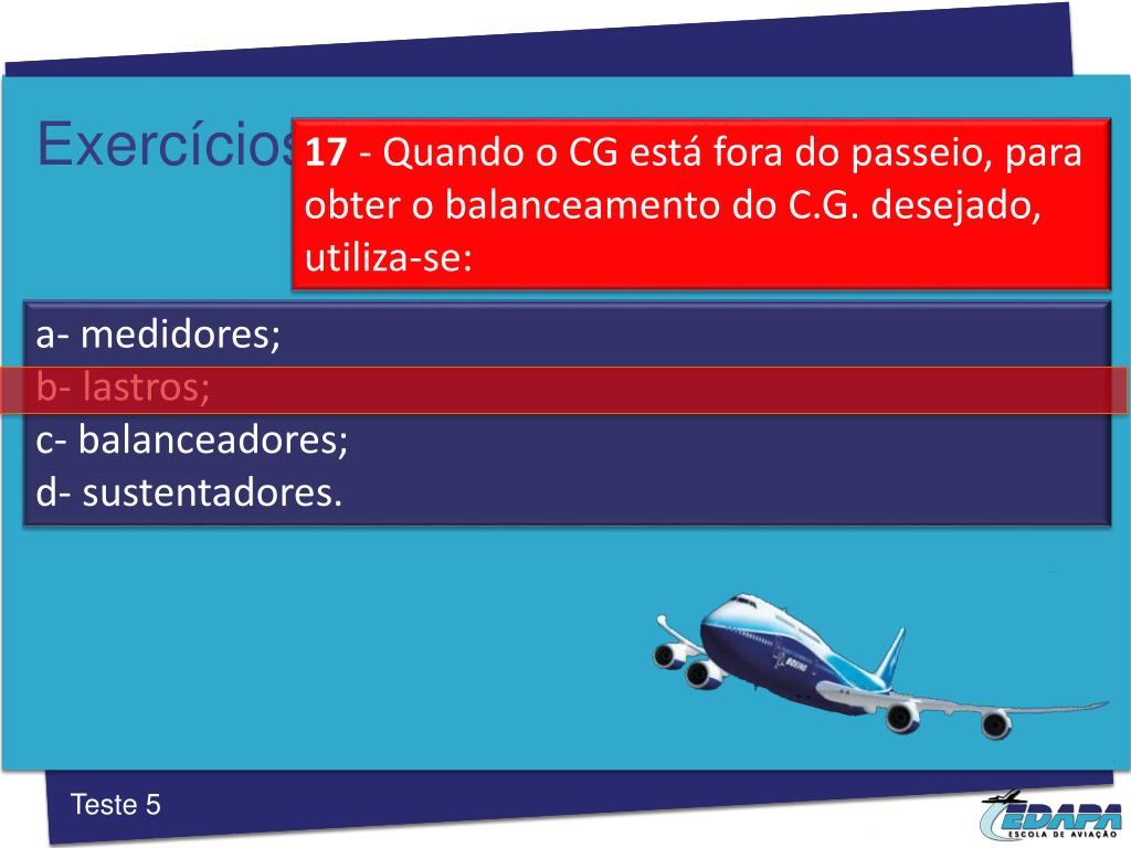 Exercícios 17 ‐Quando o CG está fora do passeio, para obter o balanceamento do C.G. desejado, utiliza-se: a- medidores; b- lastros; c- balanceadores; d- sustentadores. Teste 5