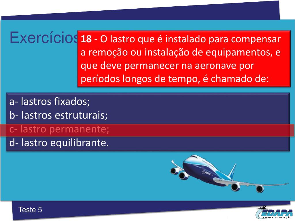Exercícios 18 ‐O lastro que é instalado para compensar a remoção ou instalação de equipamentos, e que deve permanecer na aeronave por períodos longos de tempo, é chamado de: a- lastros fixados; b- lastros estruturais; c- lastro permanente; d- lastro equilibrante. Teste 5