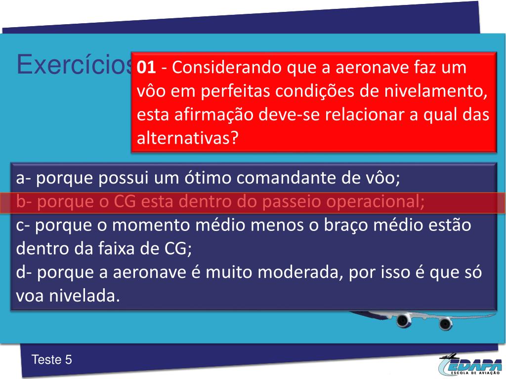 Exercícios 01 -Considerando que a aeronave faz um vôo em perfeitas condições de nivelamento, esta afirmação deve-se relacionar a qual das alternativas? a- porque possui um ótimo comandante de vôo; b- porque o CG esta dentro do passeio operacional; c- porque o momento médio menos o braço médio estão dentro da faixa de CG; d- porque a aeronave é muito moderada, por isso é que só voa nivelada. Teste 5