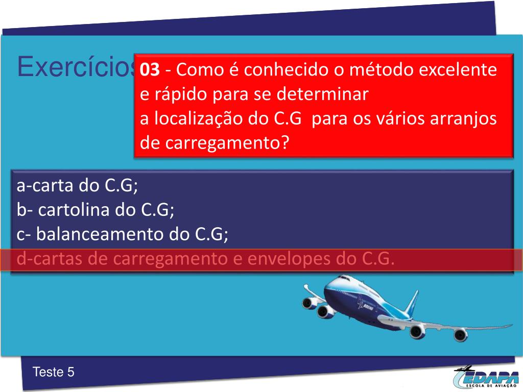 Exercícios 03 -Como é conhecido o método excelente e rápido para se determinar a localização do C.G para os vários arranjos de carregamento? a-carta do C.G; b- cartolina do C.G; c- balanceamento do C.G; d-cartas de carregamento e envelopes do C.G. Teste 5