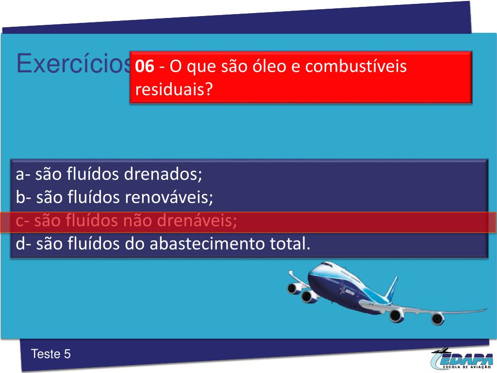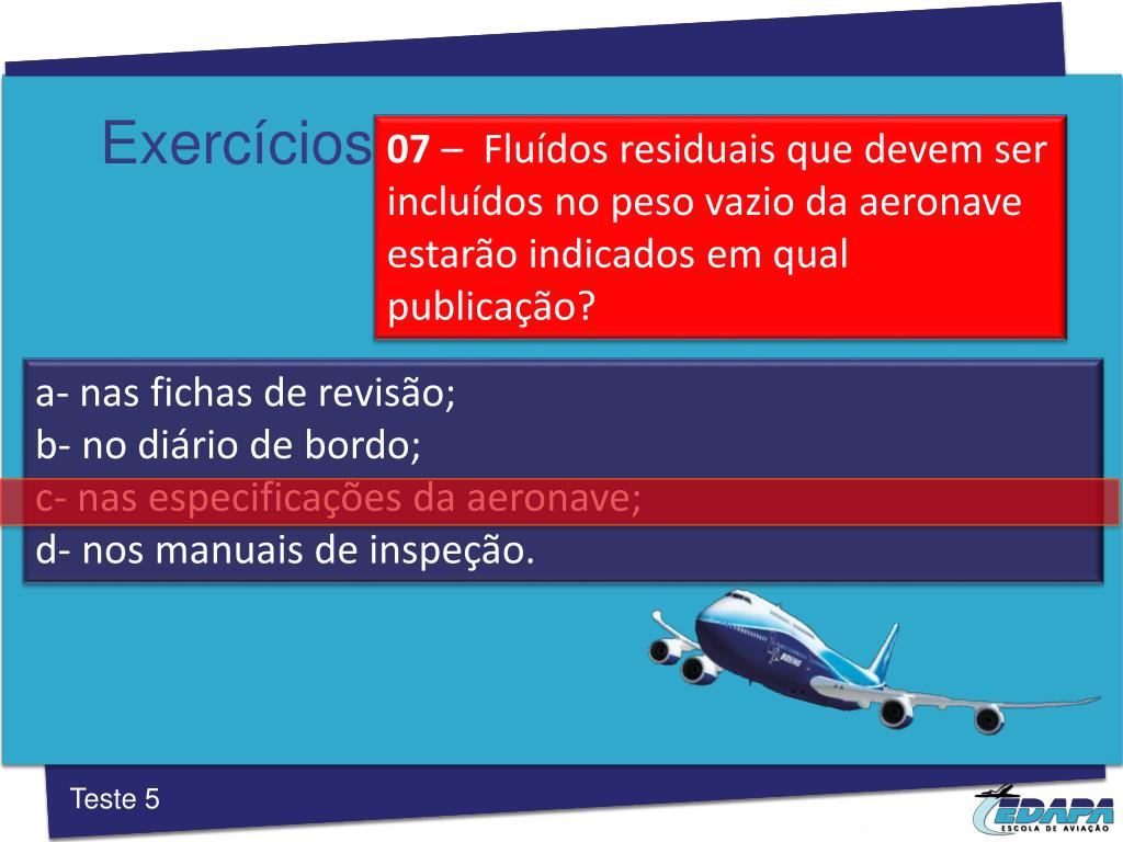 Exercícios 07 – Fluídos residuais que devem ser incluídos no peso vazio da aeronave estarão indicados em qual publicação? a- nas fichas de revisão; b- no diário de bordo; c- nas especificações da aeronave; d- nos manuais de inspeção. Teste 5