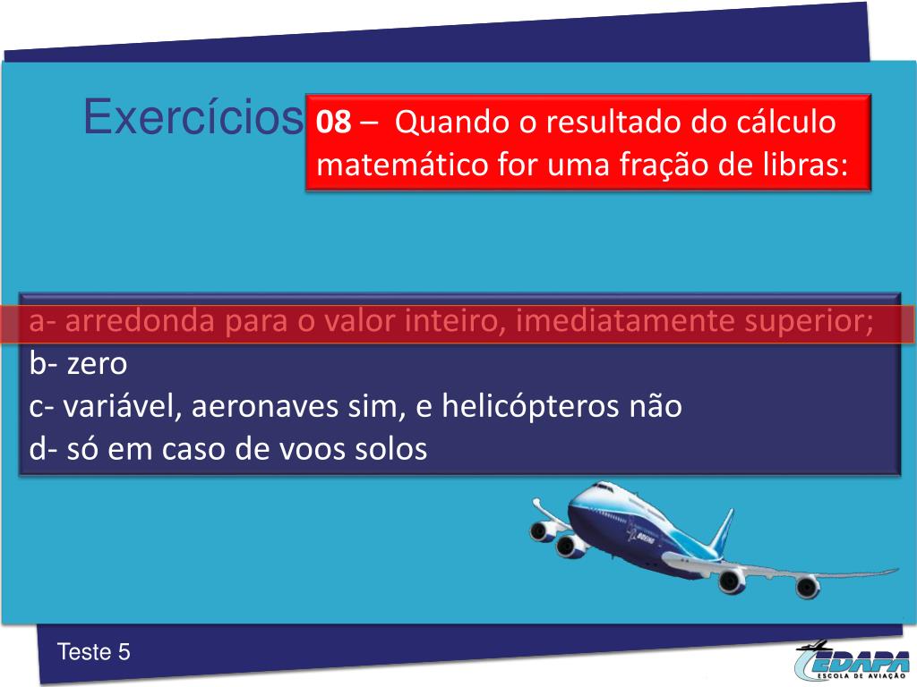 Exercícios 08 – Quando o resultado do cálculomatemáticoforumafração de libras: a- arredonda para o valor inteiro, imediatamente superior; b- zero c- variável, aeronaves sim, e helicópteros não d- só em caso de voos solos Teste 5