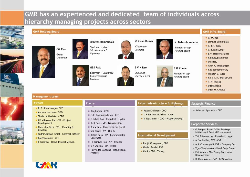 GMR has an experienced and dedicated team of individuals across hierarchy managing projects across sectors GMR Holding Board GMR Infra Board • G. M. Rao • Srinivas Bommidala • G. B.S. Raju • G. Kiran Kumar • B.V. Nageswara Rao • K.Balasubramanian • O B Raju • Arun K. Thiagarajan • K.R. Ramamoorthy • Prakash G. Apte • R.S.S.L.N. Bhaskarudu • T. R. Prasad • Udaya Holla • Uday M. Chitale G Kiran Kumar Chairman - Airports Srinivas Bommidala Chairman -Urban Infrastructure & Highways K. Balasubramanian Member Group Holding Board GM Rao Group Chairman GBS Raju Chairman – Corporate & International Business B V N Rao Chairman – Energy & Agro P M Kumar Member Group Holding Board Management team Airport Energy Urban Infrastructure & Highways Strategic Finance • B. S. Shantharaju – CEO • Andrew Harrison – COO • Shirish M Navlekar – CFO • I Prabhakara Rao – VP – Project Development • Phua chai Teck – VP - Planning & Develop • Sudhir Mathur –Chief – Commcl .Officer • Rajgopalsamy – CFO • P Sripathy – Head -Project Mgmnt. • Ashutosh Agarwala – CFO • Rajan Krishnan – COO • D R Santhana Krishna – CFO • V Jayaraman – COO – Property Devlp. • Raajkumar – CEO • G.K. Raghunandanan – CFO • G Subba Rao – President – Hydro • R. K Goel – VP – Transmission • K V V Rao – Director & President • S N Barde – VP – O & M • Ashish Basu – VP – Commercial & Contracts • I V Srinivas Rao – VP – Finance • V K Sharma – VP – Hydro • Harvinder Manocha – Head Nepal Projects Corporate Services • O Bangaru Raju – COO - Strategic Initiatives & Central Procurement • Y M Shivamurthy – President, Legal • A, Subba Rao, EVP – CIG • A.S. Cherukupalli, EVP – Company Sec. • Vijay Vancheswar – Head,Corp.Comm. • P M Kumar - ED – Group Corporate Development • R. Ram Mohan – EVP – GCM’s office International Development • Ranjit Muregesan , CEO • Madhu Terdal, EVP • Cenk – CEO – Turkey