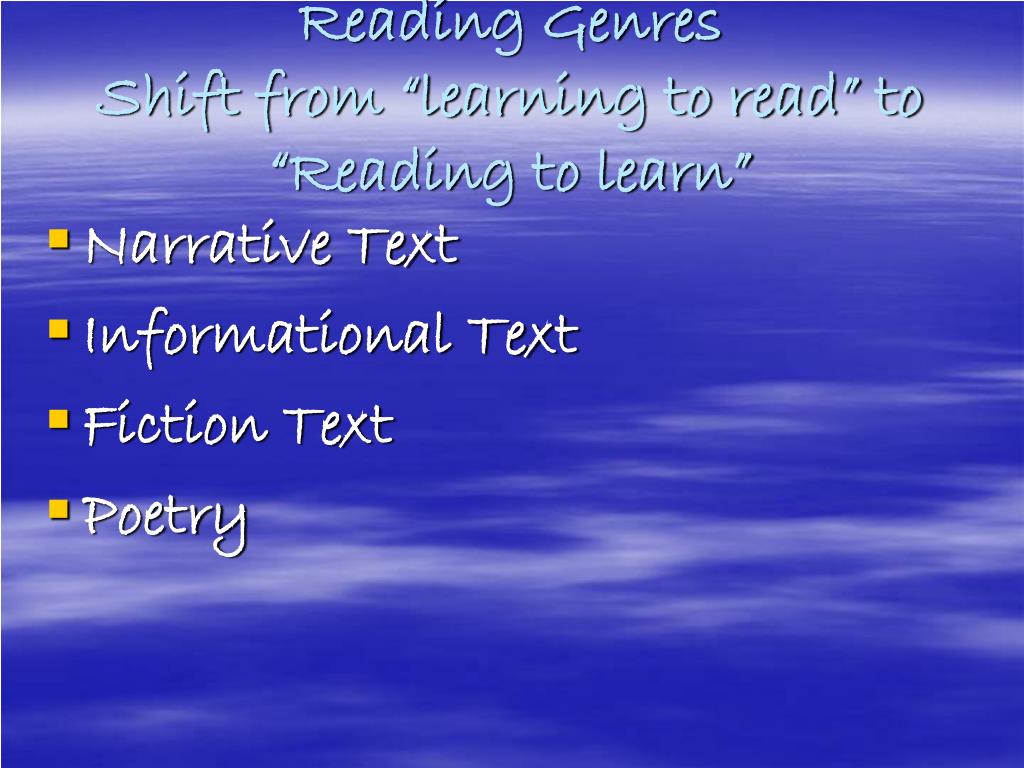 Reading GenresShift from “learning to read” to “Reading to learn” • Narrative Text • Informational Text • Fiction Text • Poetry