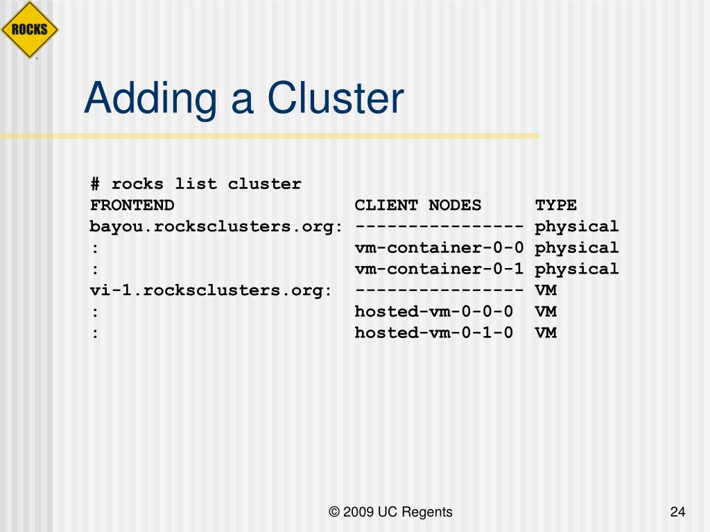 Adding a Cluster # rocks list cluster FRONTEND CLIENT NODES TYPE bayou.rocksclusters.org: ---------------- physical : vm-container-0-0 physical : vm-container-0-1 physical vi-1.rocksclusters.org: ---------------- VM : hosted-vm-0-0-0 VM : hosted-vm-0-1-0 VM © 2009 UC Regents