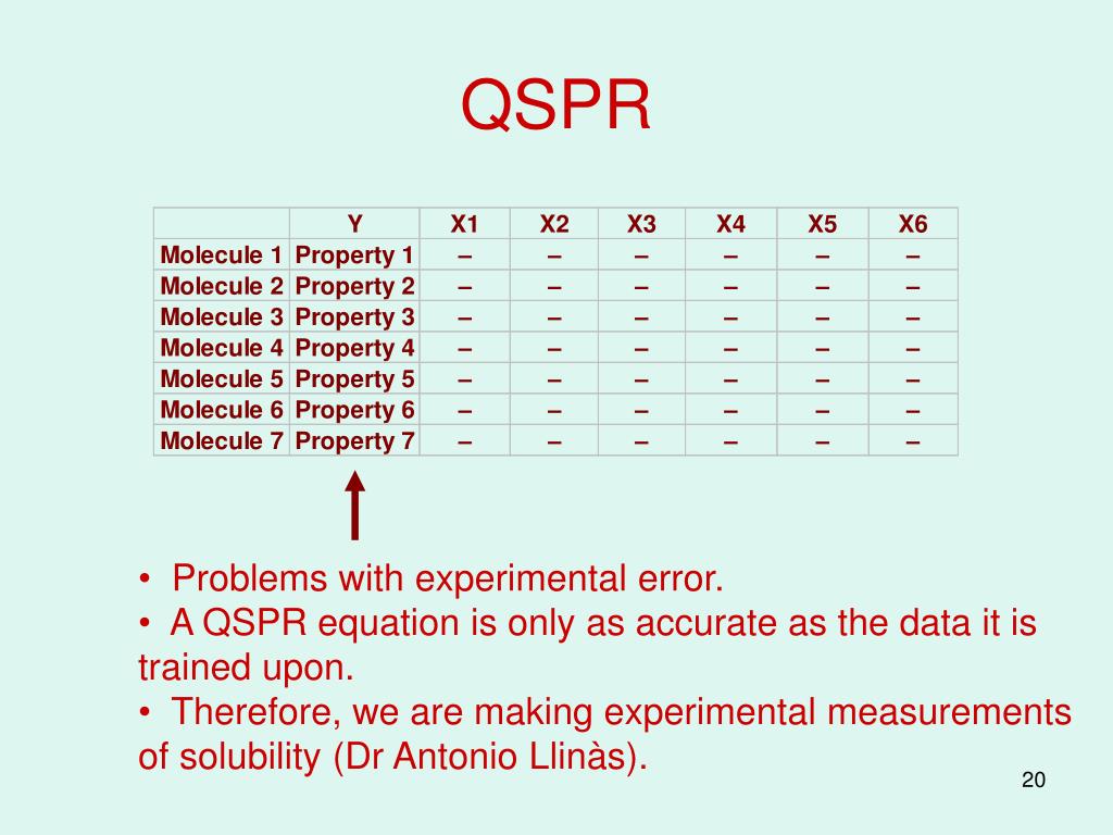 QSPR • Problems with experimental error. • A QSPR equation is only as accurate as the data it is • trained upon. • Therefore, we are making experimental measurements • of solubility (Dr Antonio Llinàs).