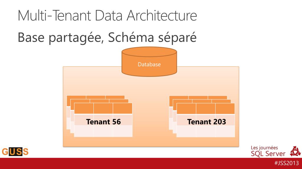 Multi-Tenant Data Architecture Base partagée, Schéma séparé Database Tenant 203 Tenant 56