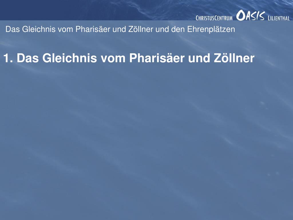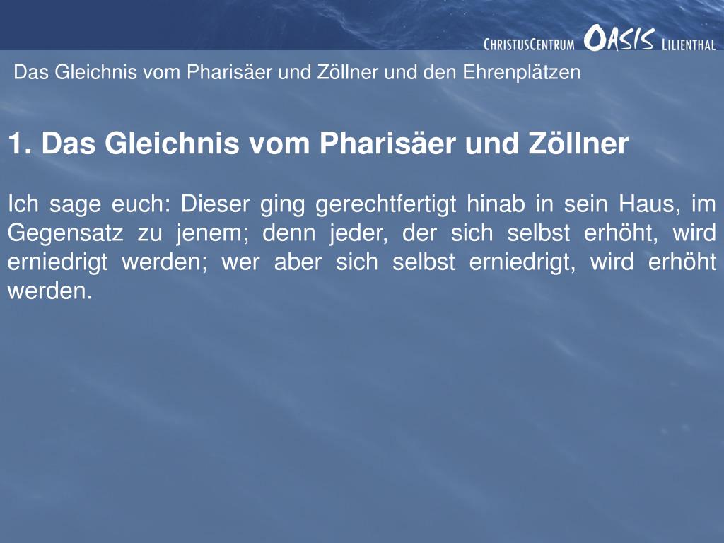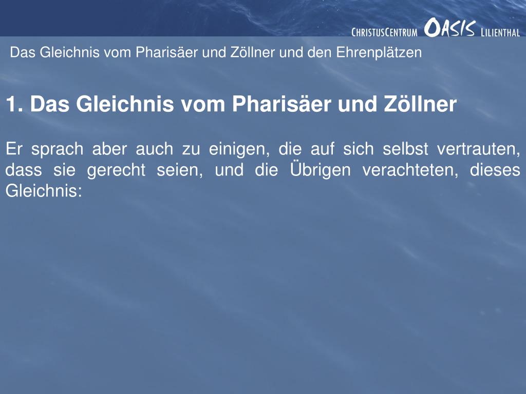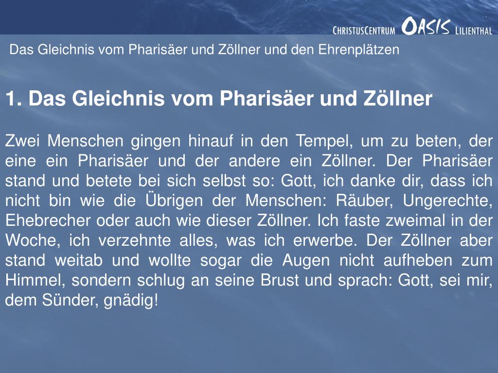 Das Gleichnis vom Pharisäer und Zöllner und den Ehrenplätzen 1. Das Gleichnis vom Pharisäer und Zöllner Er sprach aber auch zu einigen, die auf sich selbst vertrauten, dass sie gerecht seien, und die Übrigen verachteten, dieses Gleichnis: