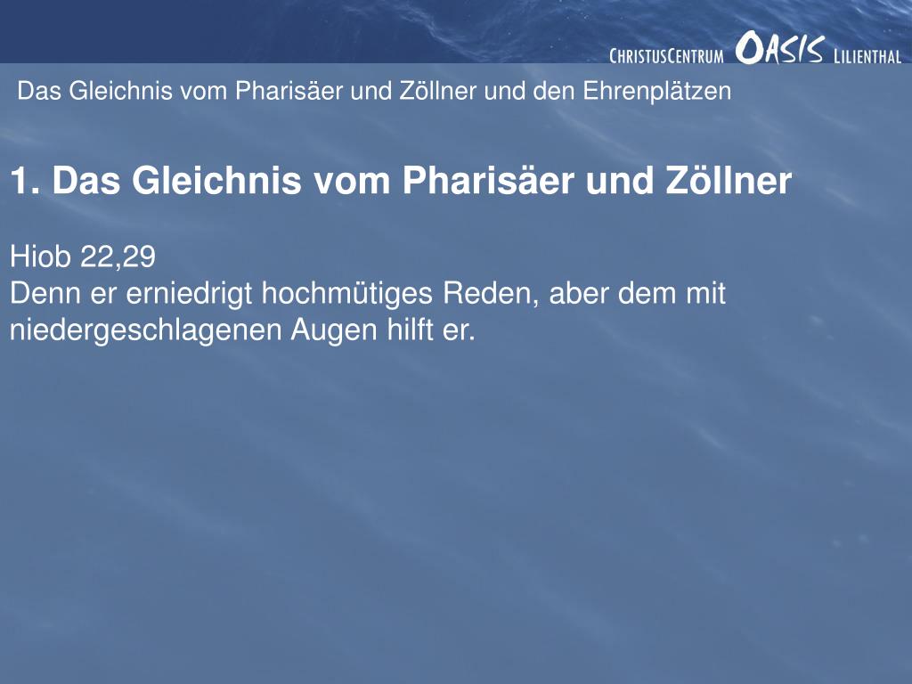 Das Gleichnis vom Pharisäer und Zöllner und den Ehrenplätzen 1. Das Gleichnis vom Pharisäer und Zöllner Hiob 22,29 Denn er erniedrigt hochmütiges Reden, aber dem mit niedergeschlagenen Augen hilft er.