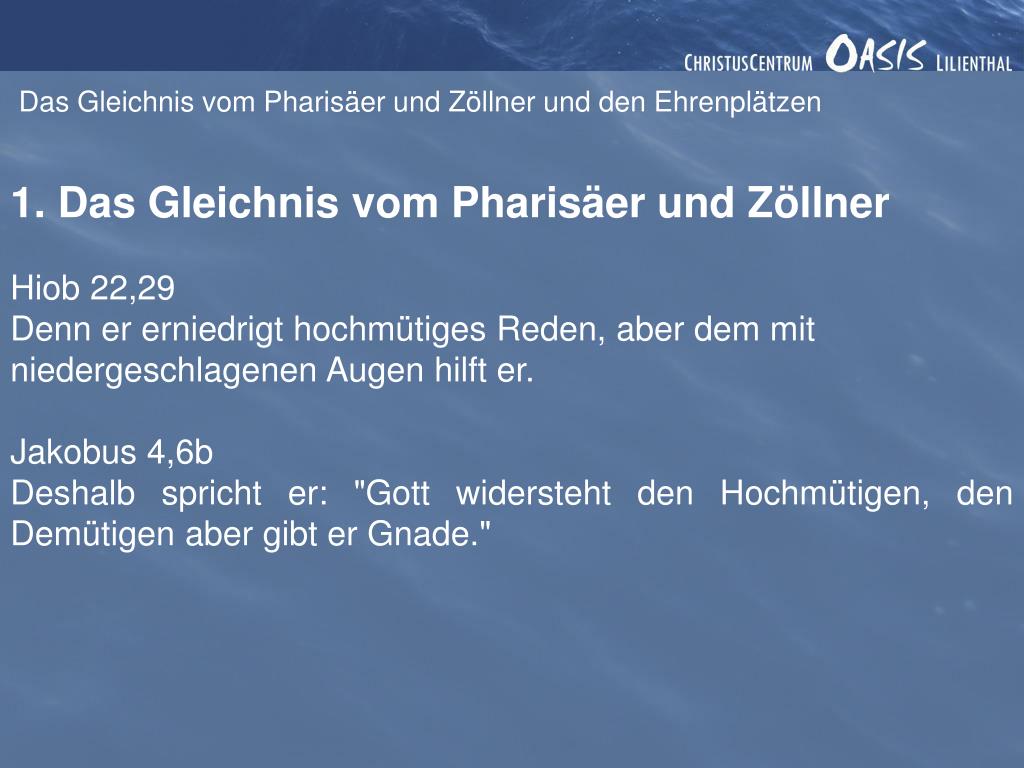 Das Gleichnis vom Pharisäer und Zöllner und den Ehrenplätzen 1. Das Gleichnis vom Pharisäer und Zöllner Hiob 22,29 Denn er erniedrigt hochmütiges Reden, aber dem mit niedergeschlagenen Augen hilft er. Jakobus 4,6b Deshalb spricht er: "Gott widersteht den Hochmütigen, den Demütigen aber gibt er Gnade."