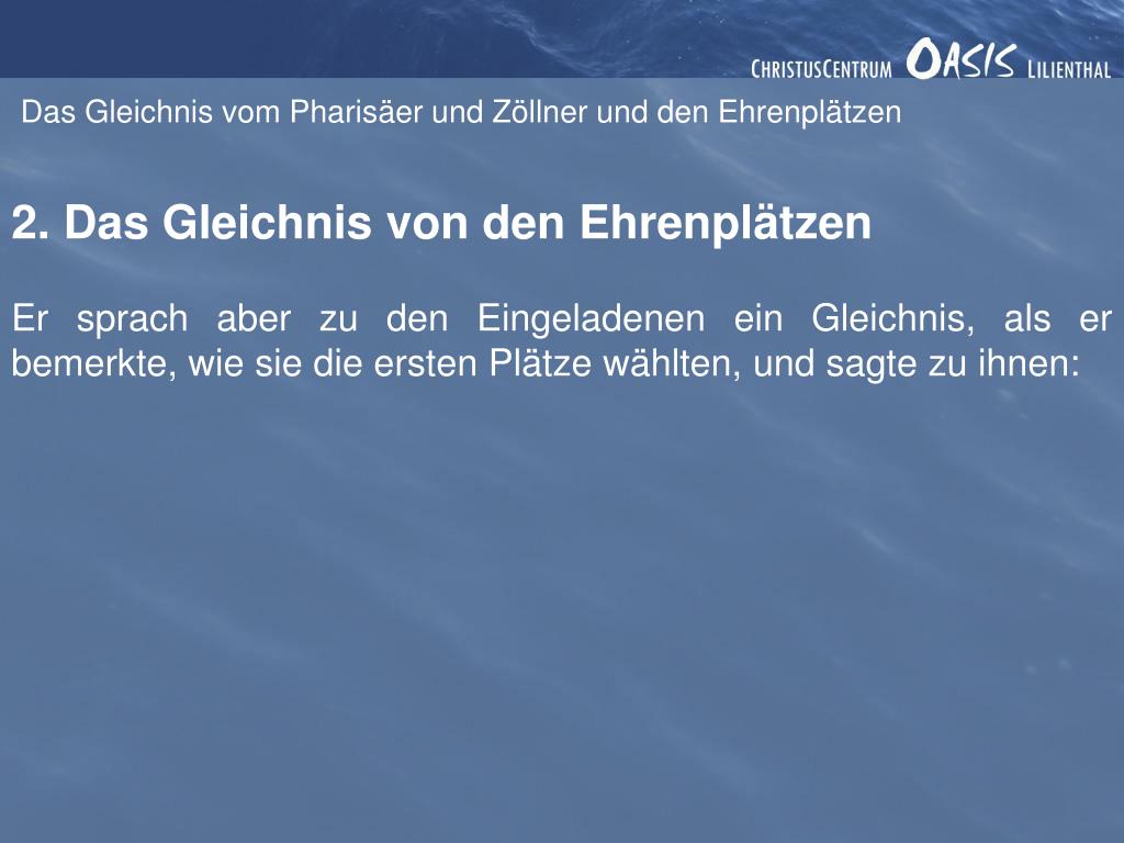Das Gleichnis vom Pharisäer und Zöllner und den Ehrenplätzen 2. Das Gleichnis von den Ehrenplätzen Er sprach aber zu den Eingeladenen ein Gleichnis, als er bemerkte, wie sie die ersten Plätze wählten, und sagte zu ihnen: