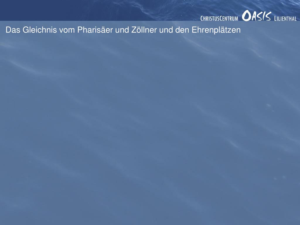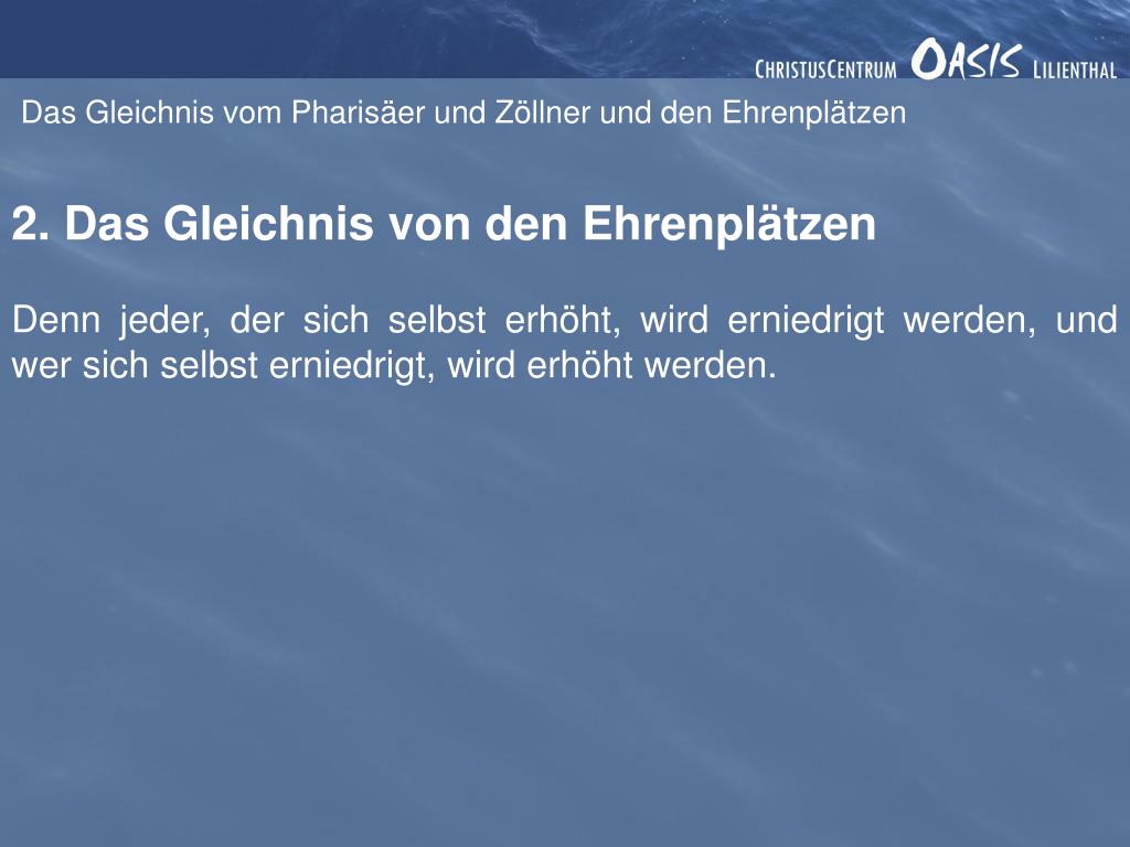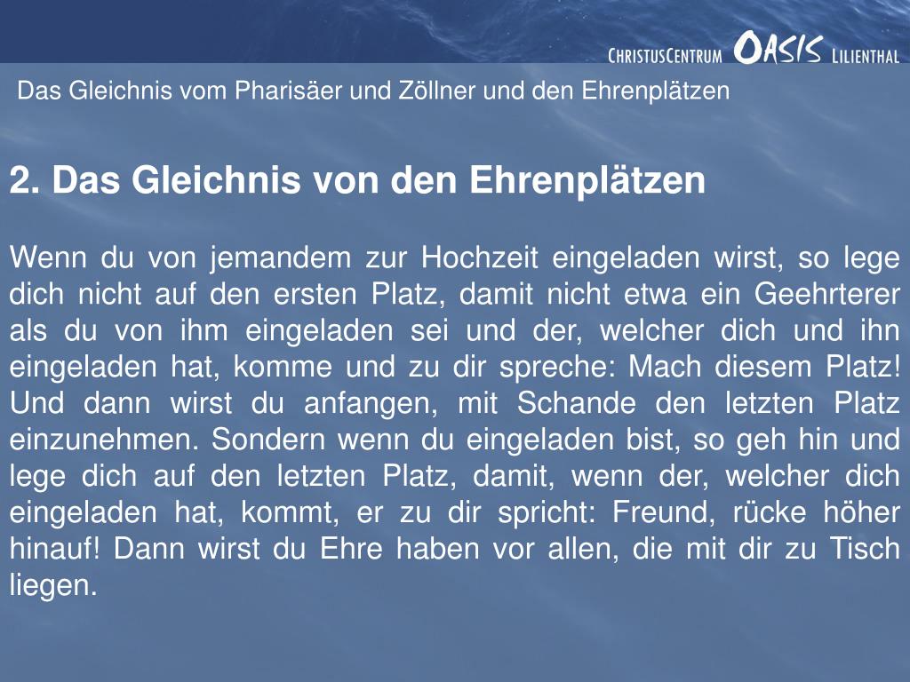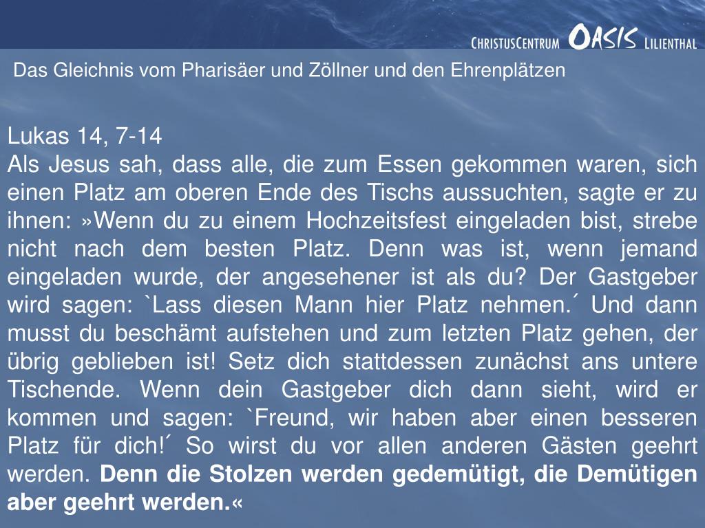 Das Gleichnis vom Pharisäer und Zöllner und den Ehrenplätzen Lukas 14, 7-14 Als Jesus sah, dass alle, die zum Essen gekommen waren, sich einen Platz am oberen Ende des Tischs aussuchten, sagte er zu ihnen: »Wenn du zu einem Hochzeitsfest eingeladen bist, strebe nicht nach dem besten Platz. Denn was ist, wenn jemand eingeladen wurde, der angesehener ist als du? Der Gastgeber wird sagen: `Lass diesen Mann hier Platz nehmen.´ Und dann musst du beschämt aufstehen und zum letzten Platz gehen, der übrig geblieben ist! Setz dich stattdessen zunächst ans untere Tischende. Wenn dein Gastgeber dich dann sieht, wird er kommen und sagen: `Freund, wir haben aber einen besseren Platz für dich!´ So wirst du vor allen anderen Gästen geehrt werden. Denn die Stolzen werden gedemütigt, die Demütigen aber geehrt werden.«