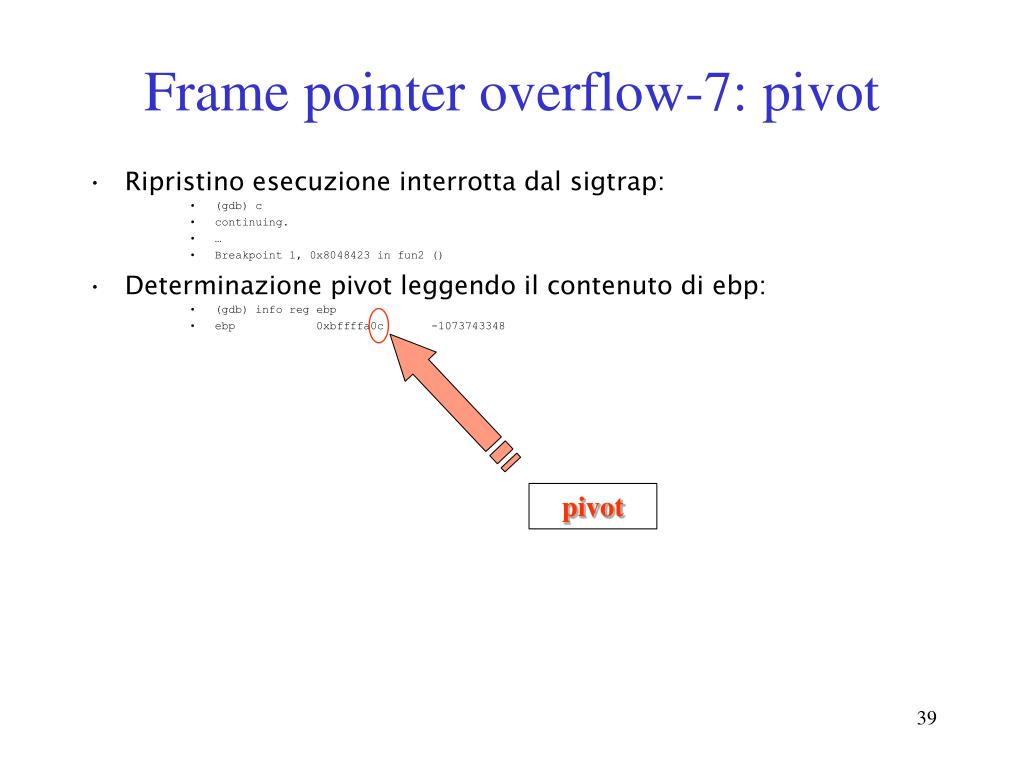 pivot Frame pointer overflow-7: pivot • Ripristino esecuzione interrotta dal sigtrap: • (gdb) c • continuing. • … • Breakpoint 1, 0x8048423 in fun2 () • Determinazione pivot leggendo il contenuto di ebp: • (gdb) info reg ebp • ebp 0xbffffa0c -1073743348