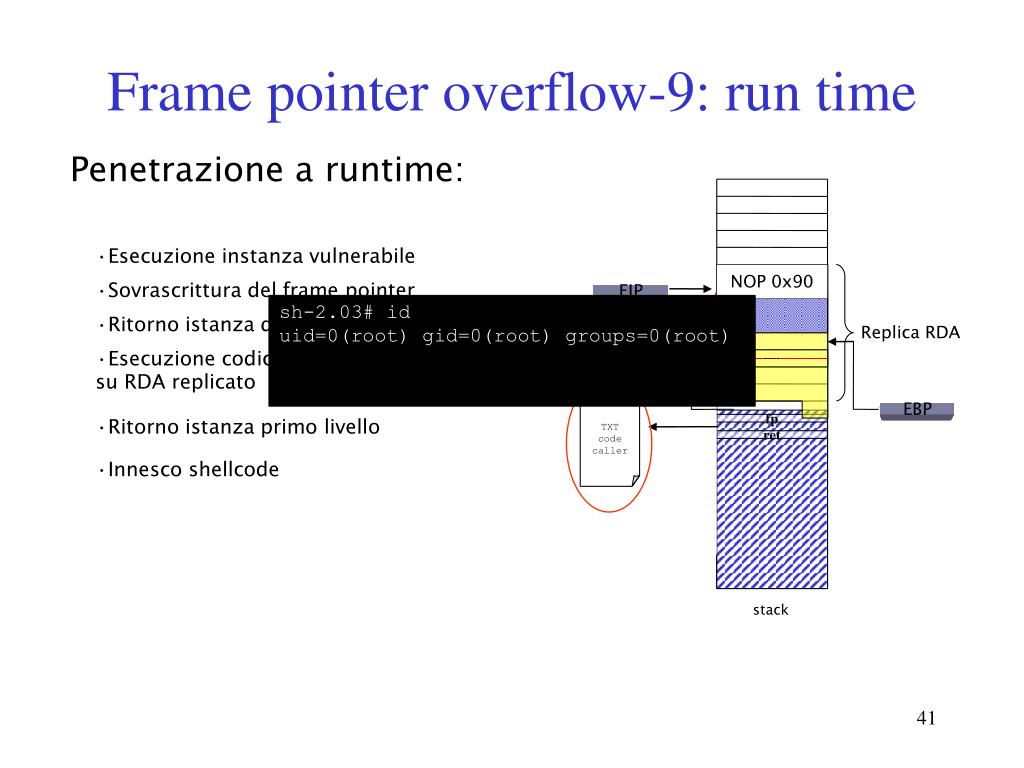 NOP 0x90 EIP sh-2.03# id uid=0(root) gid=0(root) groups=0(root) Replica RDA ret EBP fp TXT code caller ret stack Frame pointer overflow-9: run time Penetrazione a runtime: • Esecuzione instanza vulnerabile • Sovrascrittura del frame pointer • Ritorno istanza di secondo livello (leave+ret) • Esecuzione codice istanza di primo livello su RDA replicato • Ritorno istanza primo livello • Innesco shellcode