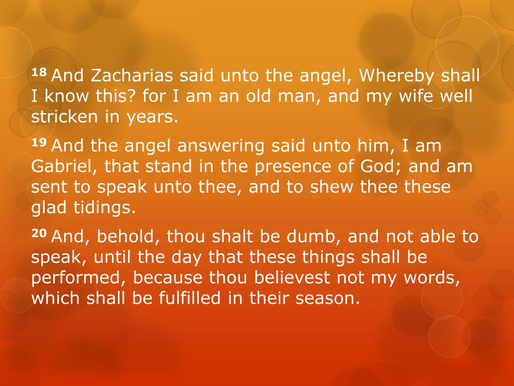 18 And Zacharias said unto the angel, Whereby shall I know this? for I am an old man, and my wife well stricken in years. 19 And the angel answering said unto him, I am Gabriel, that stand in the presence of God; and am sent to speak unto thee, and to shew thee these glad tidings. 20 And, behold, thou shalt be dumb, and not able to speak, until the day that these things shall be performed, because thou believest not my words, which shall be fulfilled in their season.
