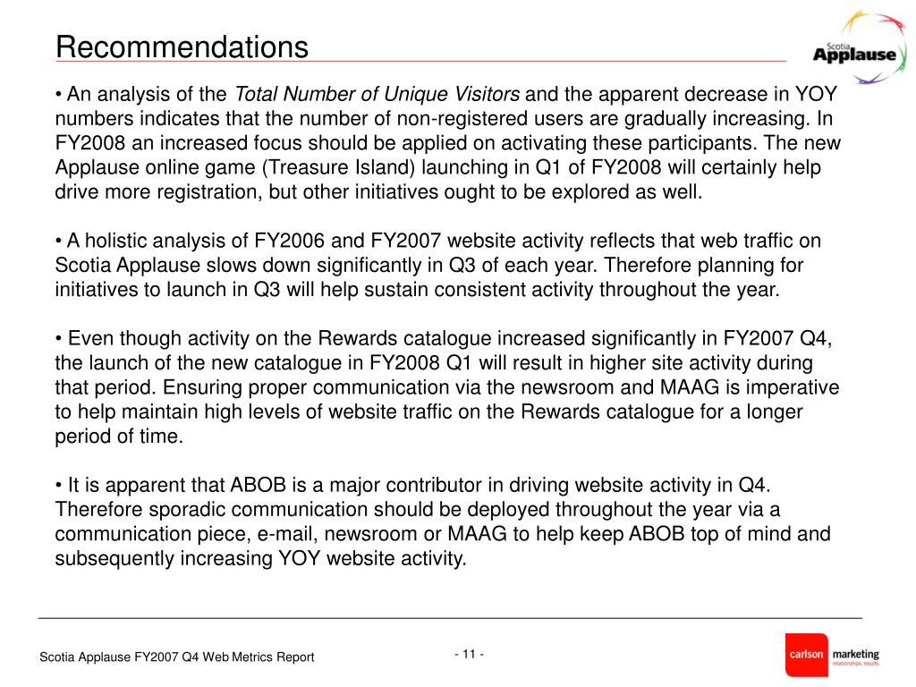 Recommendations • An analysis of the Total Number of Unique Visitors and the apparent decrease in YOY numbers indicates that the number of non-registered users are gradually increasing. In FY2008 an increased focus should be applied on activating these participants. The new Applause online game (Treasure Island) launching in Q1 of FY2008 will certainly help drive more registration, but other initiatives ought to be explored as well. • A holistic analysis of FY2006 and FY2007 website activity reflects that web traffic on Scotia Applause slows down significantly in Q3 of each year. Therefore planning for initiatives to launch in Q3 will help sustain consistent activity throughout the year. • Even though activity on the Rewards catalogue increased significantly in FY2007 Q4, the launch of the new catalogue in FY2008 Q1 will result in higher site activity during that period. Ensuring proper communication via the newsroom and MAAG is imperative to help maintain high levels of website traffic on the Rewards catalogue for a longer period of time. • It is apparent that ABOB is a major contributor in driving website activity in Q4. Therefore sporadic communication should be deployed throughout the year via a communication piece, e-mail, newsroom or MAAG to help keep ABOB top of mind and subsequently increasing YOY website activity.