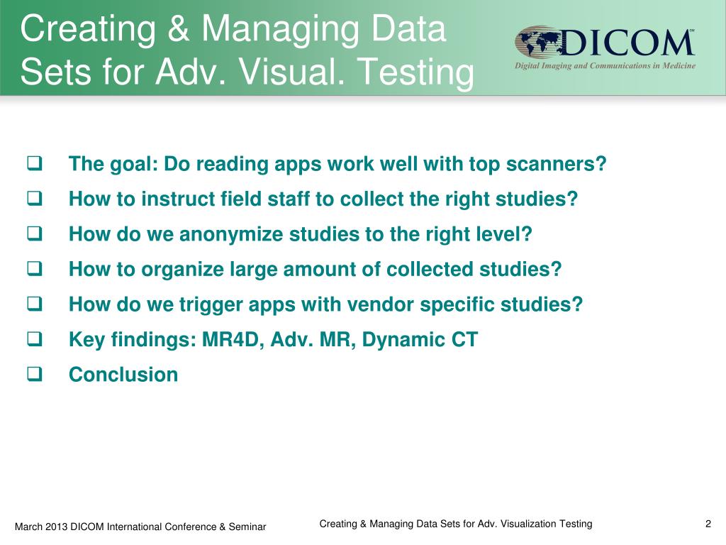 Creating & Managing Data Sets for Adv. Visual. Testing • The goal: Do reading apps work well with top scanners? • How to instruct field staff to collect the right studies? • How do we anonymize studies to the right level? • How to organize large amount of collected studies? • How do we trigger apps with vendor specific studies? • Key findings: MR4D, Adv. MR, Dynamic CT • Conclusion Creating & Managing Data Sets for Adv. Visualization Testing
