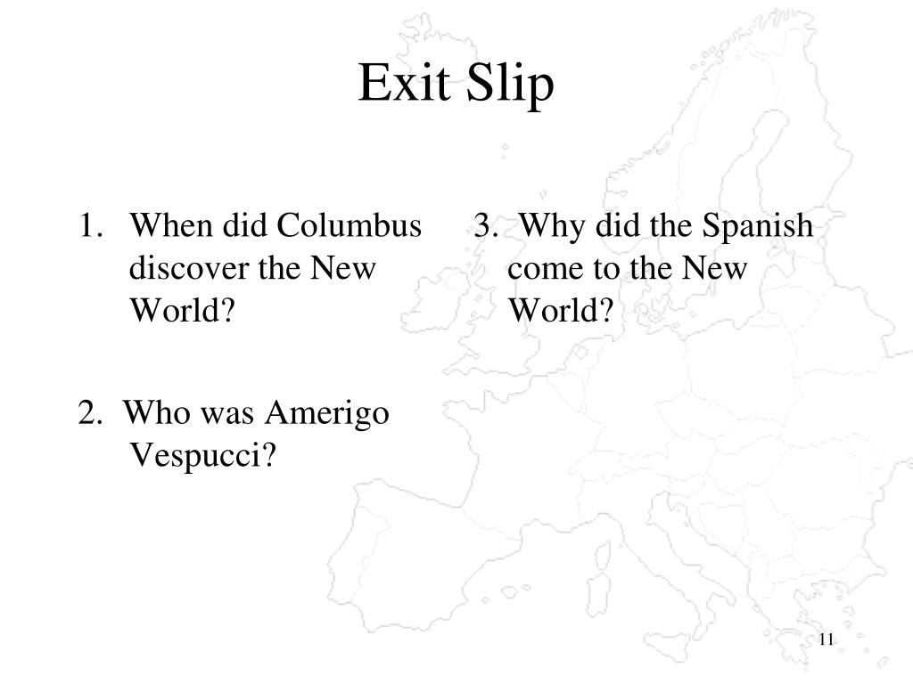 Exit Slip • When did Columbus discover the New World? 2. Who was Amerigo Vespucci? 3. Why did the Spanish come to the New World?