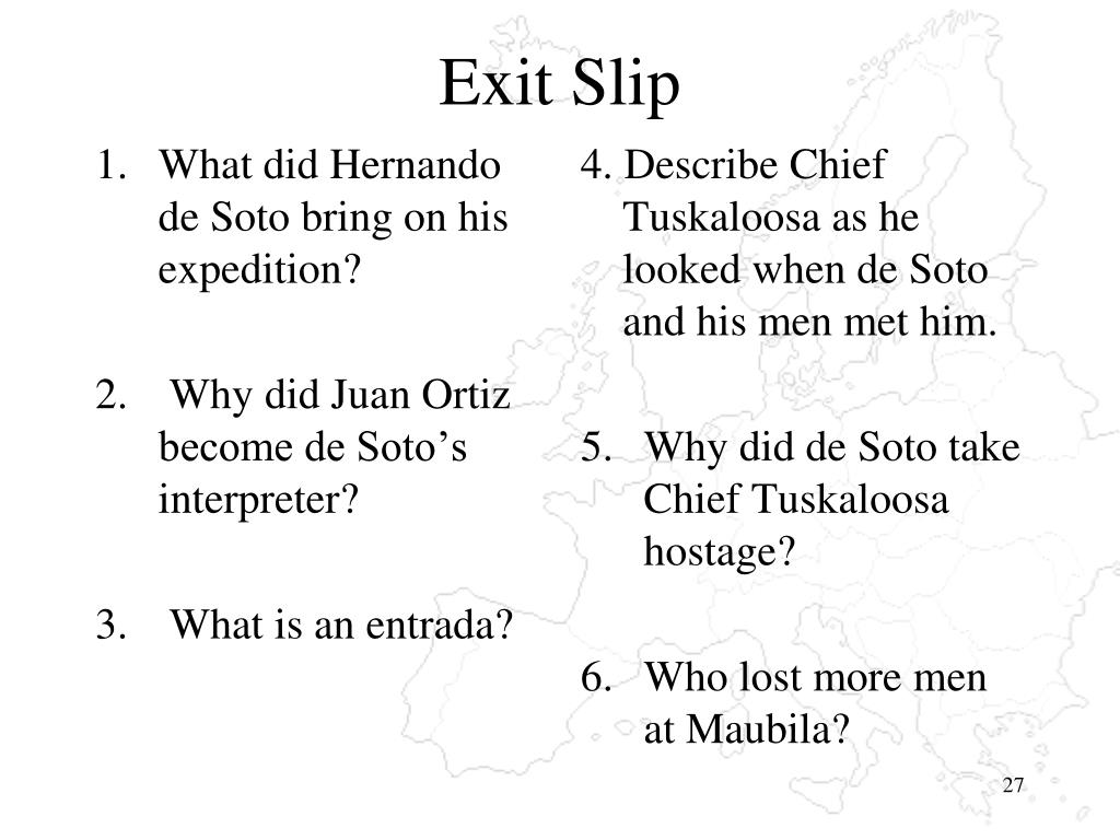 Exit Slip • What did Hernando de Soto bring on his expedition? • Why did Juan Ortiz become de Soto’s interpreter? • What is an entrada? 4. Describe Chief Tuskaloosa as he looked when de Soto and his men met him. • Why did de Soto take Chief Tuskaloosa hostage? • Who lost more men at Maubila?