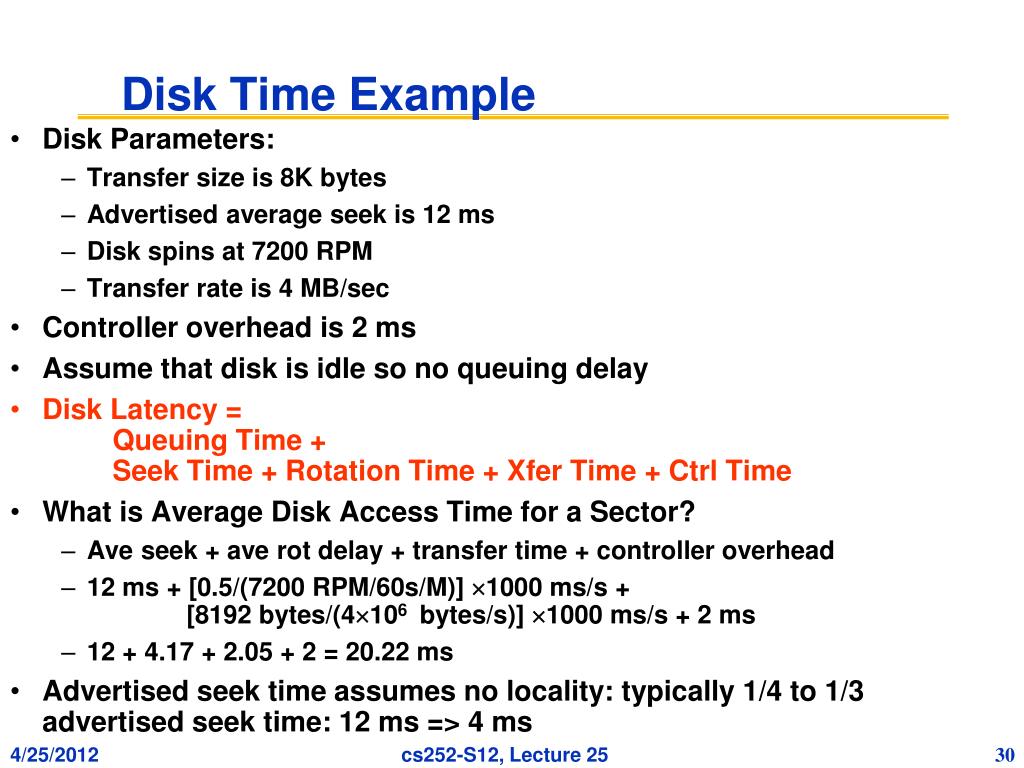 Disk Time Example • Disk Parameters: • Transfer size is 8K bytes • Advertised average seek is 12 ms • Disk spins at 7200 RPM • Transfer rate is 4 MB/sec • Controller overhead is 2 ms • Assume that disk is idle so no queuing delay • Disk Latency = Queuing Time + Seek Time + Rotation Time + Xfer Time + Ctrl Time • What is Average Disk Access Time for a Sector? • Ave seek + ave rot delay + transfer time + controller overhead • 12 ms + [0.5/(7200 RPM/60s/M)] 1000 ms/s + [8192 bytes/(4106 bytes/s)] 1000 ms/s + 2 ms • 12 + 4.17 + 2.05 + 2 = 20.22 ms • Advertised seek time assumes no locality: typically 1/4 to 1/3 advertised seek time: 12 ms => 4 ms