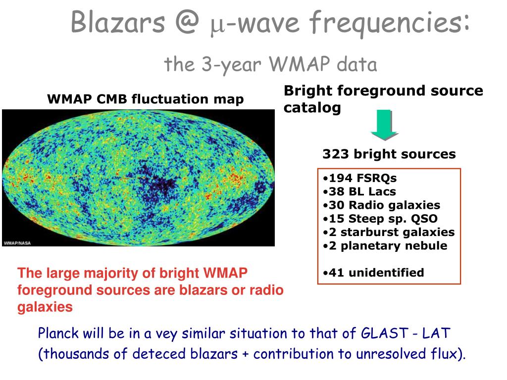 Blazars @ -wave frequencies: the 3-year WMAP data Bright foreground source catalog WMAP CMB fluctuation map 323 bright sources • 194 FSRQs • 38 BL Lacs • 30 Radio galaxies • 15 Steep sp. QSO • 2 starburst galaxies • 2 planetary nebule • 41 unidentified The large majority of bright WMAP foreground sources are blazars or radio galaxies Planck will be in a vey similar situation to that of GLAST - LAT (thousands of deteced blazars + contribution to unresolved flux).