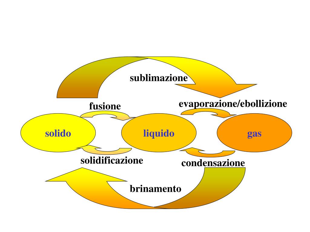 sublimazione evaporazione/ebollizione fusione solido liquido gas solidificazione condensazione brinamento