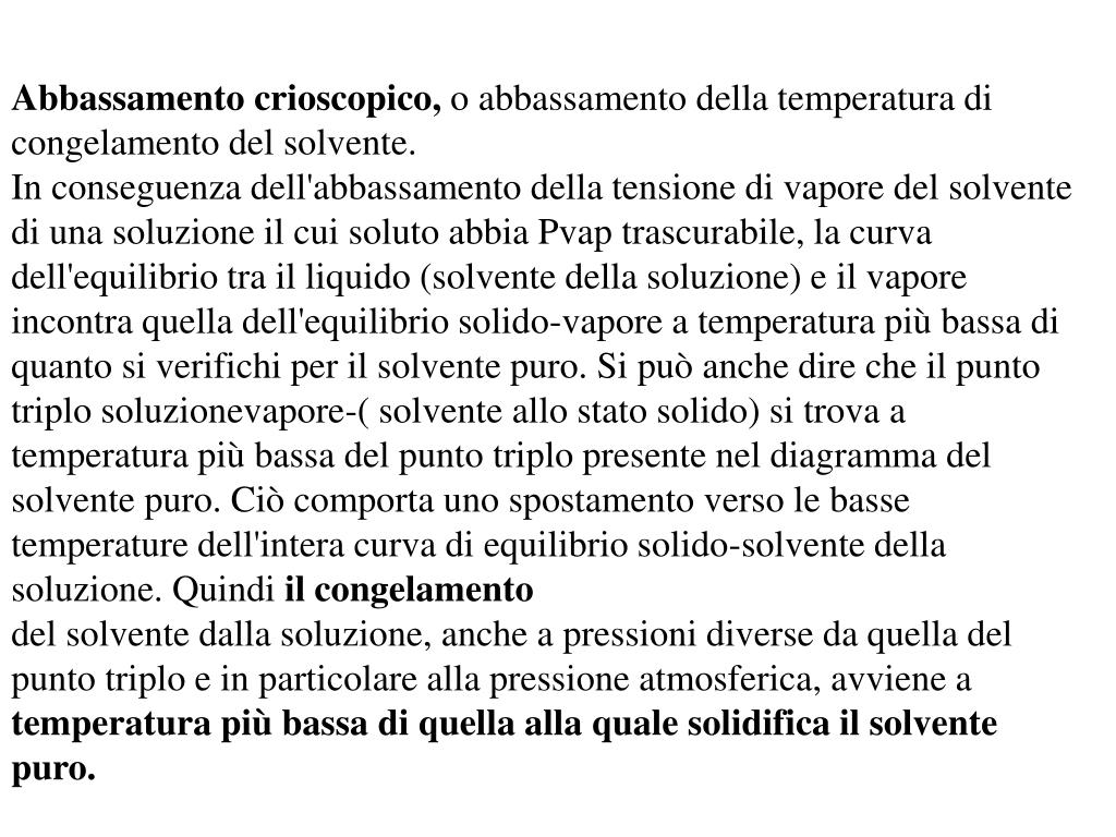 Abbassamento crioscopico, o abbassamento della temperatura di congelamento del solvente. In conseguenza dell'abbassamento della tensione di vapore del solvente di una soluzione il cui soluto abbia Pvap trascurabile, la curva dell'equilibrio tra il liquido (solvente della soluzione) e il vapore incontra quella dell'equilibrio solido-vapore a temperatura più bassa di quanto si verifichi per il solvente puro. Si può anche dire che il punto triplo soluzionevapore-( solvente allo stato solido) si trova a temperatura più bassa del punto triplo presente nel diagramma del solvente puro. Ciò comporta uno spostamento verso le basse temperature dell'intera curva di equilibrio solido-solvente della soluzione. Quindi il congelamento del solvente dalla soluzione, anche a pressioni diverse da quella del punto triplo e in particolare alla pressione atmosferica, avviene a temperatura più bassa di quella alla quale solidifica il solvente puro.