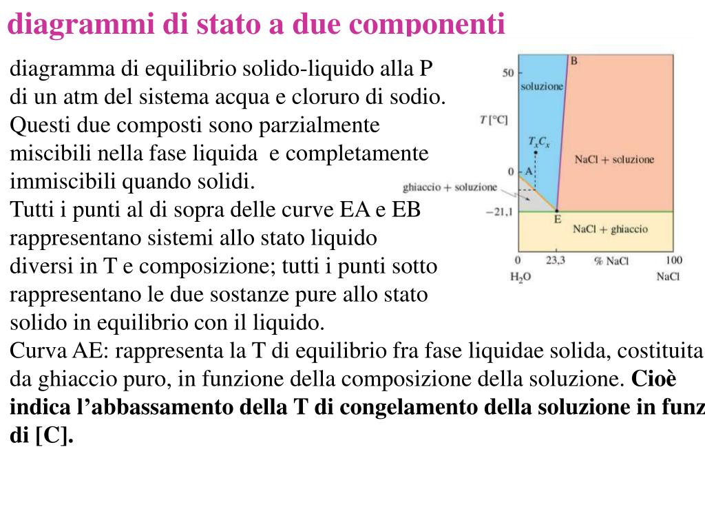 diagrammi di stato a due componenti diagramma di equilibrio solido-liquido alla P di un atm del sistema acqua e cloruro di sodio. Questi due composti sono parzialmente miscibili nella fase liquida e completamente immiscibili quando solidi. Tutti i punti al di sopra delle curve EA e EB rappresentano sistemi allo stato liquido diversi in T e composizione; tutti i punti sotto rappresentano le due sostanze pure allo stato solido in equilibrio con il liquido. Curva AE: rappresenta la T di equilibrio fra fase liquidae solida, costituita da ghiaccio puro, in funzione della composizione della soluzione. Cioè indica l’abbassamento della T di congelamento della soluzione in funzione di [C].