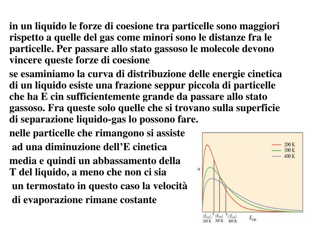 in un liquido le forze di coesione tra particelle sono maggiori rispetto a quelle del gas come minori sono le distanze fra le particelle. Per passare allo stato gassoso le molecole devono vincere queste forze di coesione se esaminiamo la curva di distribuzione delle energie cinetica di un liquido esiste una frazione seppur piccola di particelle che ha E cin sufficientemente grande da passare allo stato gassoso. Fra queste solo quelle che si trovano sulla superficie di separazione liquido-gas lo possono fare. nelle particelle che rimangono si assiste ad una diminuzione dell’E cinetica media e quindi un abbassamento della T del liquido, a meno che non ci sia un termostato in questo caso la velocità di evaporazione rimane costante