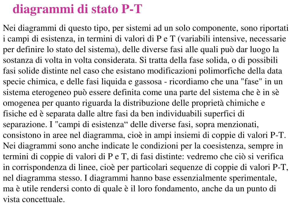 diagrammi di stato P-T Nei diagrammi di questo tipo, per sistemi ad un solo componente, sono riportati i campi di esistenza, in termini di valori di P e T (variabili intensive, necessarie per definire lo stato del sistema), delle diverse fasi alle quali può dar luogo la sostanza di volta in volta considerata. Si tratta della fase solida, o di possibili fasi solide distinte nel caso che esistano modificazioni polimorfiche della data specie chimica, e delle fasi liquida e gassosa - ricordiamo che una "fase" in un sistema eterogeneo può essere definita come una parte del sistema che è in sè omogenea per quanto riguarda la distribuzione delle proprietà chimiche e fisiche ed è separata dalle altre fasi da ben individuabili superfici di separazione. I "campi di esistenza“ delle diverse fasi, sopra menzionati, consistono in aree nel diagramma, cioè in ampi insiemi di coppie di valori P-T. Nei diagrammi sono anche indicate le condizioni per la coesistenza, sempre in termini di coppie di valori di P e T, di fasi distinte: vedremo che ciò si verifica in corrispondenza di linee, cioè per particolari sequenze di coppie di valori P-T, nel diagramma stesso. I diagrammi hanno base essenzialmente sperimentale, ma è utile rendersi conto di quale è il loro fondamento, anche da un punto di vista concettuale.