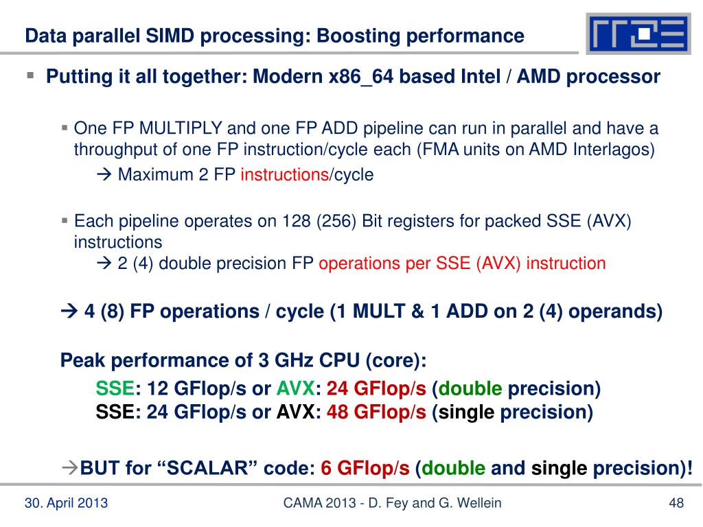 Data parallel SIMD processing: Boosting performance • Putting it all together: Modern x86_64 based Intel / AMD processor • One FP MULTIPLY and one FP ADD pipeline can run in parallel and have a throughput of one FP instruction/cycle each (FMA units on AMD Interlagos) Maximum 2 FP instructions/cycle • Each pipeline operates on 128 (256) Bit registers for packed SSE (AVX) instructions 2 (4) double precision FP operations per SSE (AVX) instruction 4 (8) FP operations / cycle (1 MULT & 1 ADD on 2 (4) operands) Peak performance of 3 GHz CPU (core): SSE: 12 GFlop/s or AVX: 24 GFlop/s (double precision)SSE: 24 GFlop/s or AVX: 48 GFlop/s (single precision) • BUT for “SCALAR” code: 6 GFlop/s (double and single precision)! CAMA 2013 - D. Fey and G. Wellein