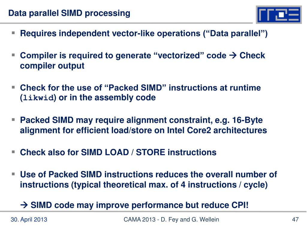 Data parallel SIMD processing • Requires independent vector-like operations (“Data parallel”) • Compiler is required to generate “vectorized” code Check compiler output • Check for the use of “Packed SIMD” instructions at runtime (likwid) or in the assembly code • Packed SIMD may require alignment constraint, e.g. 16-Byte alignment for efficient load/store on Intel Core2 architectures • Check also for SIMD LOAD / STORE instructions • Use of Packed SIMD instructions reduces the overall number of instructions (typical theoretical max. of 4 instructions / cycle) SIMD code may improve performance but reduce CPI! CAMA 2013 - D. Fey and G. Wellein