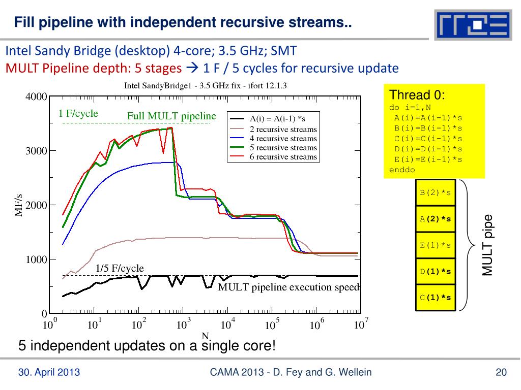 Fill pipeline with independent recursive streams.. Intel Sandy Bridge (desktop) 4-core; 3.5 GHz; SMT MULT Pipeline depth: 5 stages 1 F / 5 cycles for recursive update Thread 0:do i=1,N A(i)=A(i-1)*s B(i)=B(i-1)*s C(i)=C(i-1)*s D(i)=D(i-1)*s E(i)=E(i-1)*senddo B(2)*s A(2)*s E(1)*s D(1)*s MULT pipe C(1)*s 5 independent updates on a single core! CAMA 2013 - D. Fey and G. Wellein